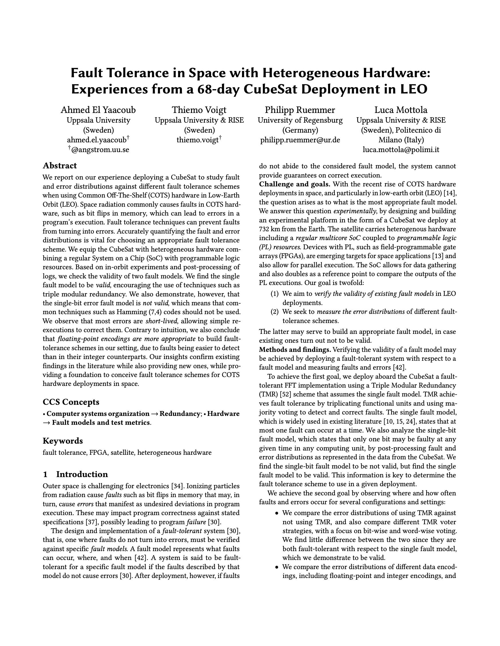 We deployed a CubeSat orbiting in LEO from November 2024 until the end of February 2025, collecting data on faults on a heterogeneous FPGA/ARM device and low-power NVM chips. Find the papers and the data sets!